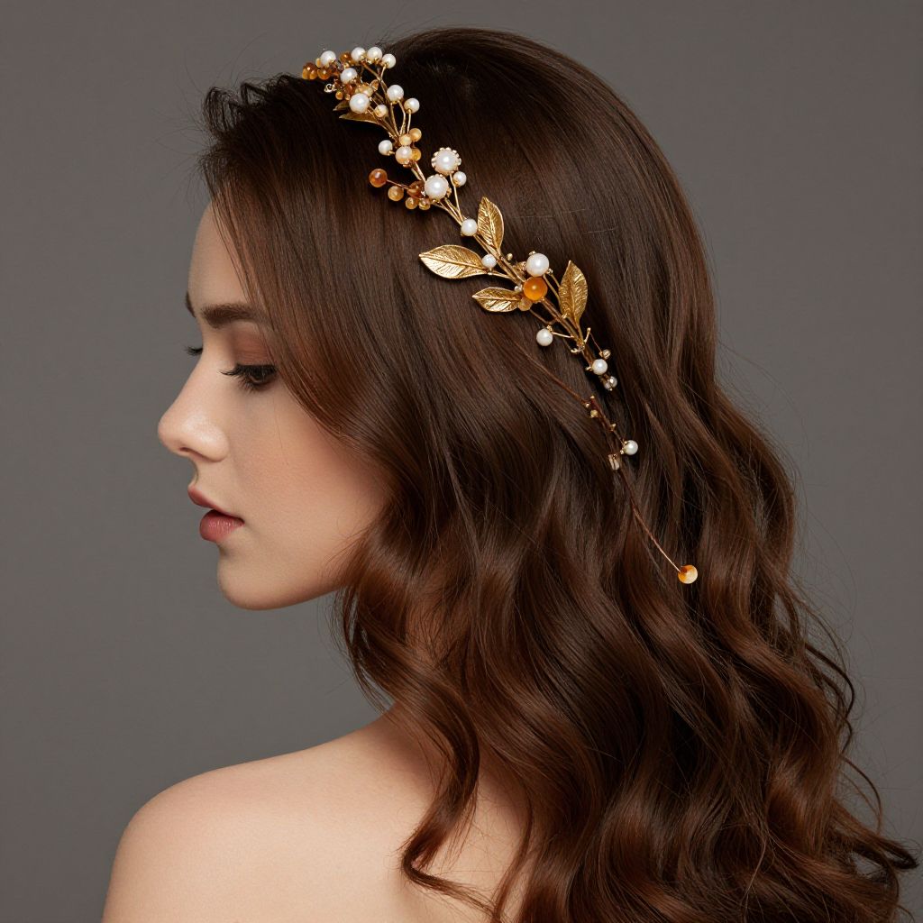 Elegant wavy brown hair cascades gracefully around a woman's shoulders, adorned with a gilded handmade headpiece featuring intricate gold leaf designs and delicate pearl accents, complemented by subtle twigs and honey-toned embellishments.