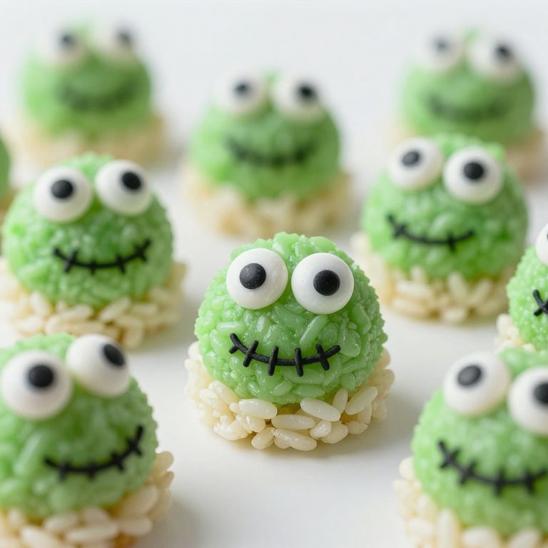 Playful Frankenstein-inspired treats transform ordinary rice krispies into whimsical, green monstrosities with wide, googly eyes and stitched mouths, defying the mundane with their eerie charm.