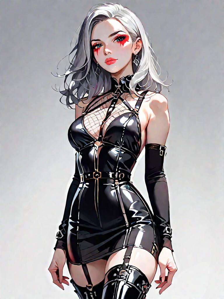 1girl, realistic face, Strappy black satin mini dress, intricate harness detailing, sheer mesh panels, adjustable leather straps, silver hardware accents, high neckline, open back design, fitted silhouette, bold cutouts, paired with thigh-high stiletto boots, glossy finish, edgy yet elegant.