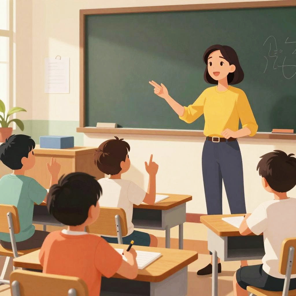 Digital illustration of a smiling female teacher with short black hair, yellow shirt, and dark pants, pointing at a chalkboard in a bright classroom with five