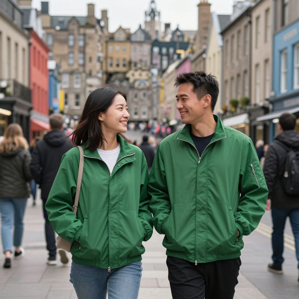 Two individuals, a man and a woman both wearing matching green jackets, stand side by side on a bustling city street, smiling warmly as they face each other amidst a backdrop of colorful historic buildings and pedestrians.
