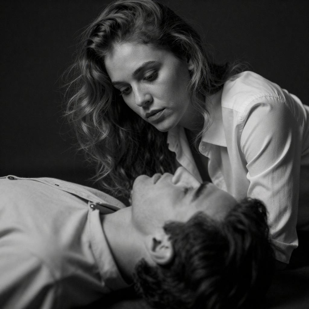 Black-and-white photograph of a woman with wavy hair, wearing a light-colored shirt, leaning over a man with dark hair, lying down. The woman's face is close to the man's head, her expression intense. The man's face is partially obscured. The image has a high-contrast, dramatic style.