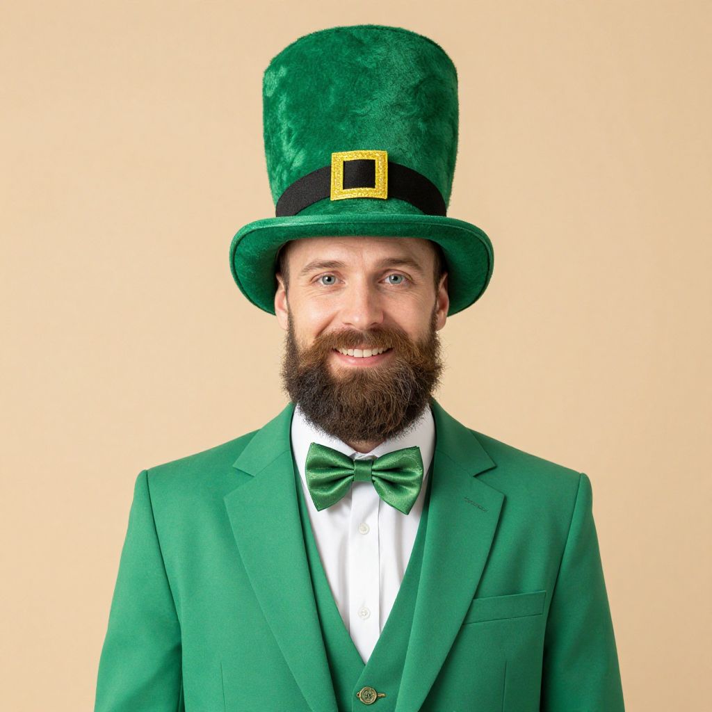 Saint Pattys Day Costume, man with a beard wearing a green suit and a hat