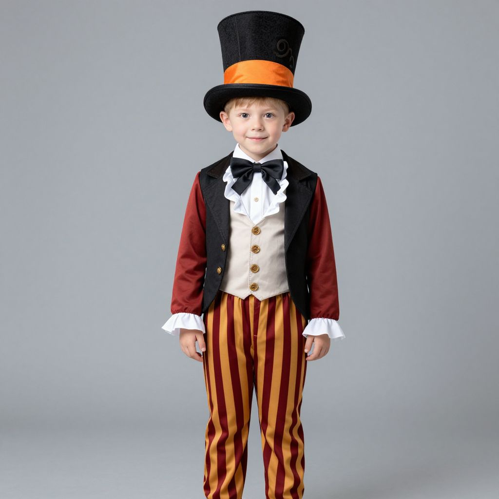 Mad Hatter Kid Costume, image of a little boy dressed in a top hat and striped pants