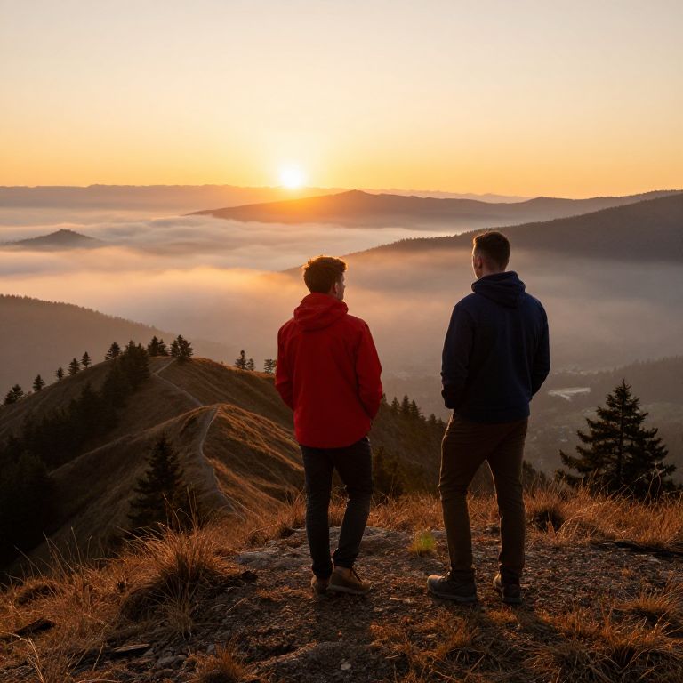Two brother prompt: A dynamic scene of two brothers standing on a sun-drenched mountain ridge, one in a red jacket, the other in a navy hoodie, gazing at a sunset over a foggy valley with distant pine trees and a golden horizon, cinematic lighting, hyperrealistic, 4K detail.