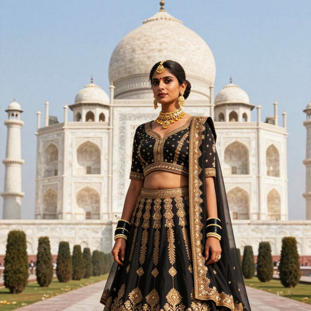 Indian woman in black and gold traditional attire stands in front of the Taj Mahal, with blue sky and garden path background. Photorealistic digital art