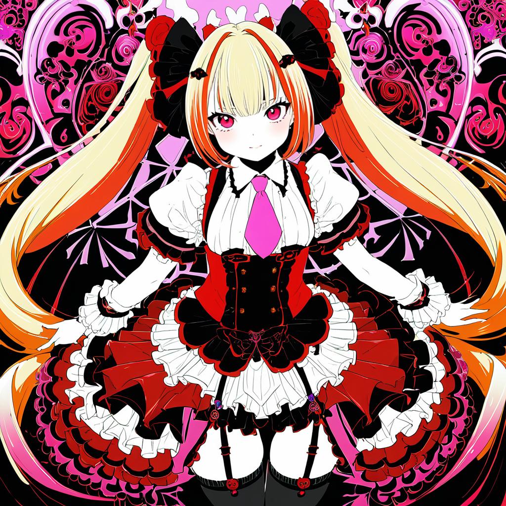 Asmodeus (umineko), umineko no naku koro ni, 1girl, red eyes, blonde hair, long hair, twintails, showgirl skirt, thighhighs, pink necktie, garter straps, by artist tokiani, leet