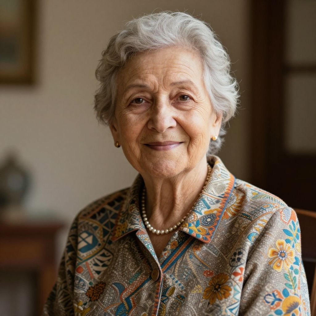 Photograph of an elderly woman with short, curly gray hair and wrinkles, smiling warmly. She wears a colorful, patterned blouse with intricate designs in orange, blue, and red, and a simple pearl necklace with a blue button. The background is softly blurred, featuring a vase with pink flowers on the left and a framed picture on the right. The lighting is natural, highlighting her kind expression and textured skin. The overall mood is warm and welcoming.