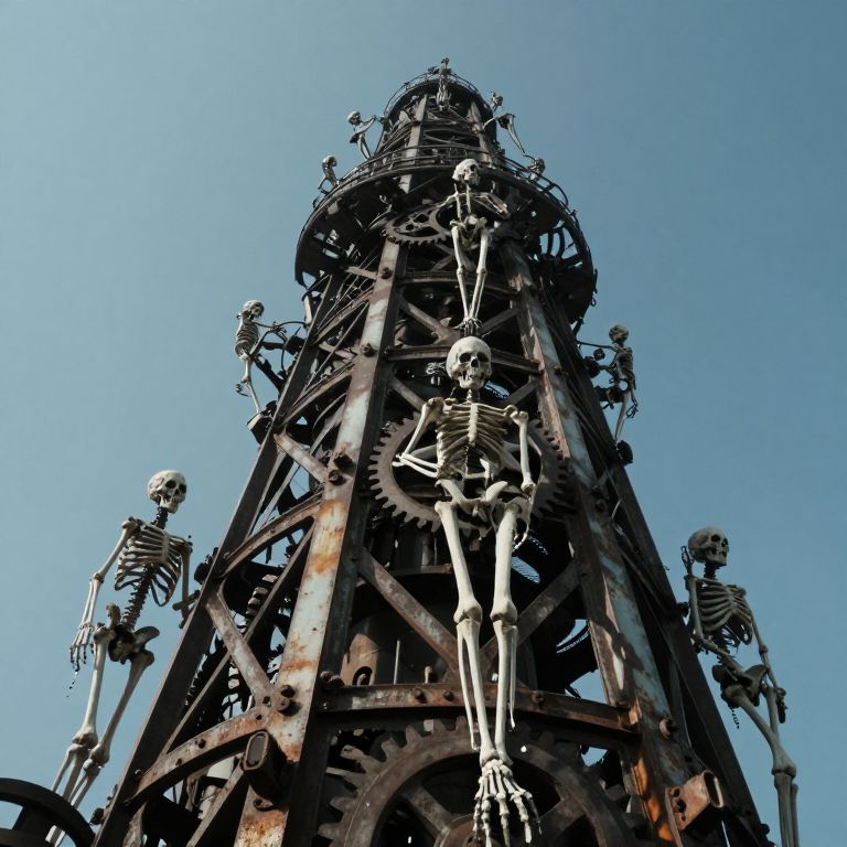 Photograph of rusted, skeletal metal tower adorned with multiple human skeletons, set against a clear blue sky. Gothic, macabre art style.