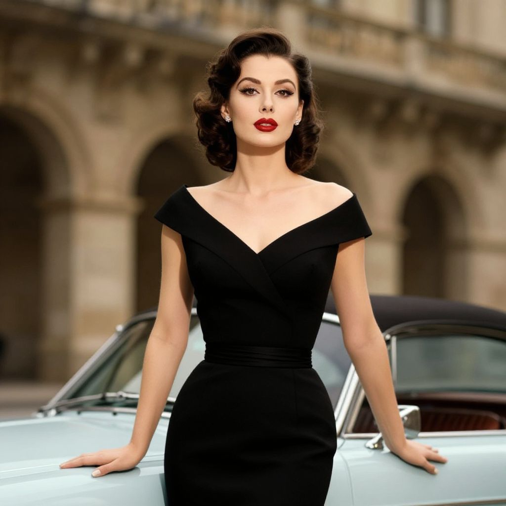 Photorealistic digital artwork of a fair-skinned woman with wavy, dark brown hair styled in vintage curls. She wears a form-fitting, off-the-shoulder black dress with a deep V-neck, accentuating her slender figure. Her bold red lipstick matches her confident expression. She stands with her hands resting on a shiny, light blue classic car, with blurred, arched stone buildings in the background. The image combines 1950s elegance with modern digital artistry, emphasizing her classic beauty and the timeless allure of the scene.