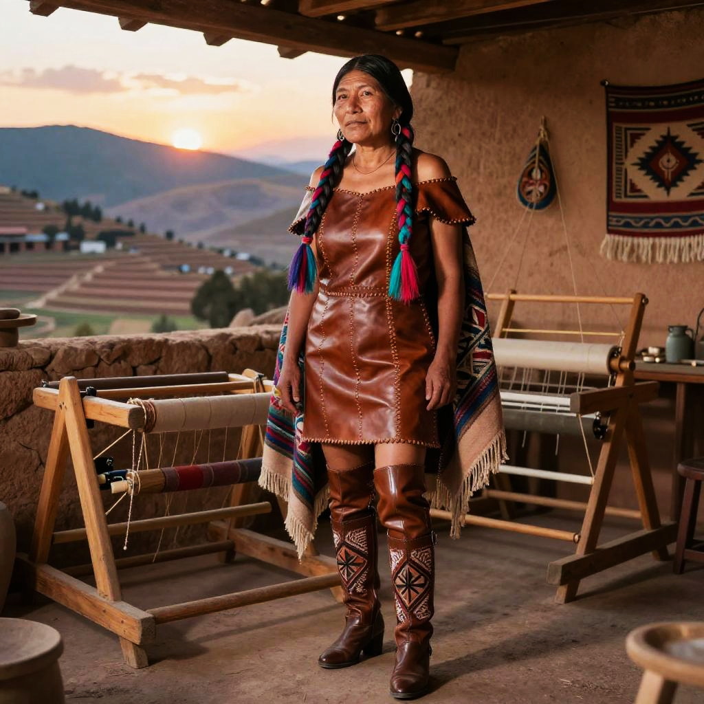 Image in the style of Andean Textile Futurism, resolute indigenous Andean textile artisan, long braided hair wrapped with colorful woven ribbons, sturdy matriarchal figure, (Leather & Latex Off-Shoulder Dress:1.3), earth-toned hand-stitched leather off-shoulder dress, recycled-latex thigh-high boots embroidered with traditional geometric motifs, alpaca-woven shawl, sunset terraced mountain studio with wooden looms and warm adobe walls studio background
