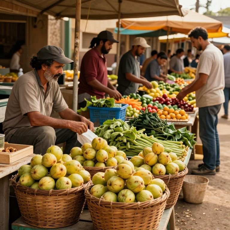 This photograph captures a vibrant, outdoor market scene. In the foreground, a middle-aged man with a beard and gray cap, wearing a beige shirt and dark pants, sits on a stool, sorting green, yellow-coated fruits in a wicker basket. To his right, another man in a maroon shirt and black cap stands, arranging vegetables in a blue crate. The background features several other men, some in white shirts, standing and working at various stalls under yellow and orange canopy tents. The market is bustling with colorful produce, including green beans, tomatoes, and oranges. The setting is sunlit, with a warm, slightly saturated color palette.