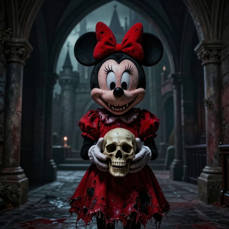 The image depicts a dark, eerie scene set in a castle-like corridor with arched doorways and stone pillars. The central figure is a menacing, distorted version of Minnie Mouse, standing in the foreground. She is wearing a tattered, blood-stained red dress with a large, red bow on her head, and her face is contorted into a sinister grin, revealing sharp teeth. In her hands, she holds a small, decaying skull. The background features a faintly visible castle tower, adding to the ominous atmosphere. The overall color palette is dominated by dark, muted tones, with the red dress and bow providing a stark contrast. The composition is tightly framed, drawing the viewer's attention to the eerie figure and the skull, creating a sense of tension and horror.