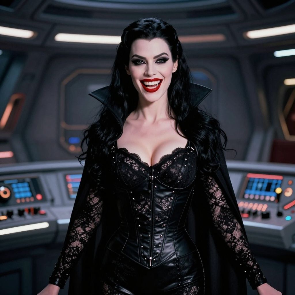 Photograph of a striking woman with pale skin and long, wavy black hair, standing in a futuristic control room. She wears a black lace corset with a deep neckline, accentuating her large breasts, and a matching black lace cape with high, pointed shoulders. Her bold red lipstick contrasts with her dark makeup and the black outfit. The background features blurred, illuminated control panels with buttons and screens, adding a sci-fi atmosphere. Her confident smile and poised stance exude a vampiric, commanding presence. The image has a dramatic, high-contrast lighting style.