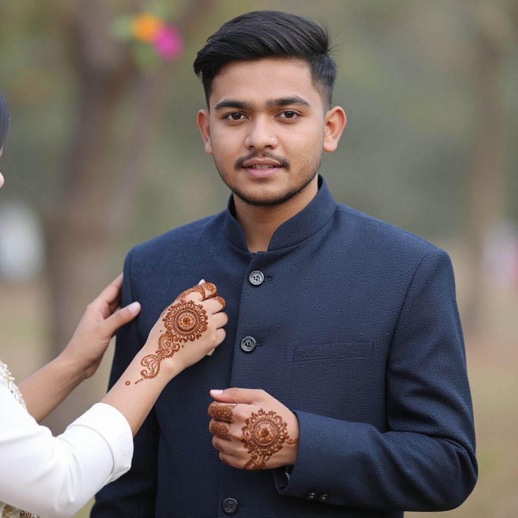Dress mehndi function groom, 1boy, male focus, solo, facial hair, realistic, black hair, mustache, blurry background, flower, blurry, long sleeves, outdoors, looking at viewer, jacket, asian, short hair, buttons