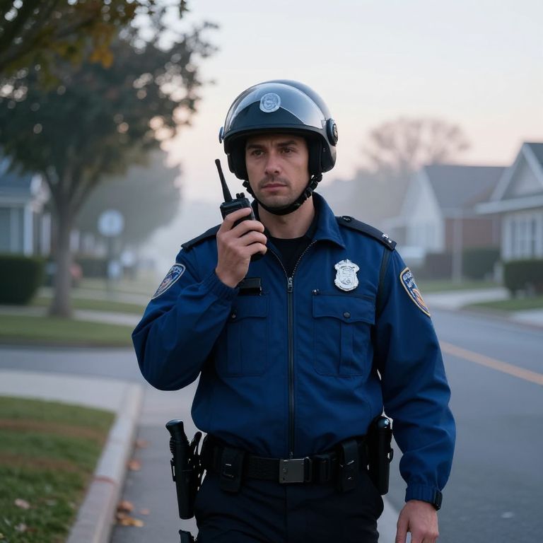 Police officer prompt: A confident police officer in a crisp blue jacket and helmet, patrolling a quiet neighborhood at dawn, holding a walkie-talkie, surrounded by trees and a calm suburban landscape, with subtle fog in the air, showing a sense of duty and community trust.