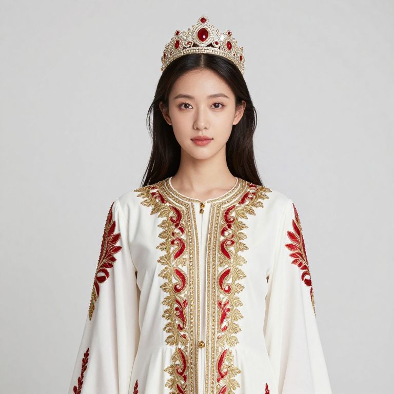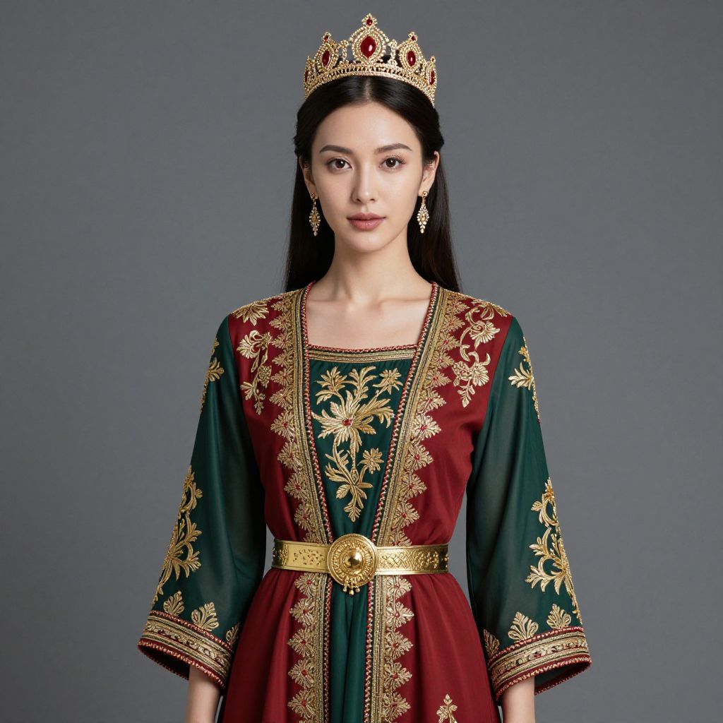 Photograph of an East Asian woman with long black hair, wearing a white, ornate robe adorned with red and gold intricate embroidery along the V-neck and sleeves. She has a fair complexion and a subtle, gentle smile. Her head is adorned with a gold crown featuring red gemstones. The background is a plain, solid grey, which makes her regal attire stand out prominently. Her expression is calm and composed, conveying a sense of dignity and grace. The lighting is even, highlighting the textures and details of her robe and crown.
