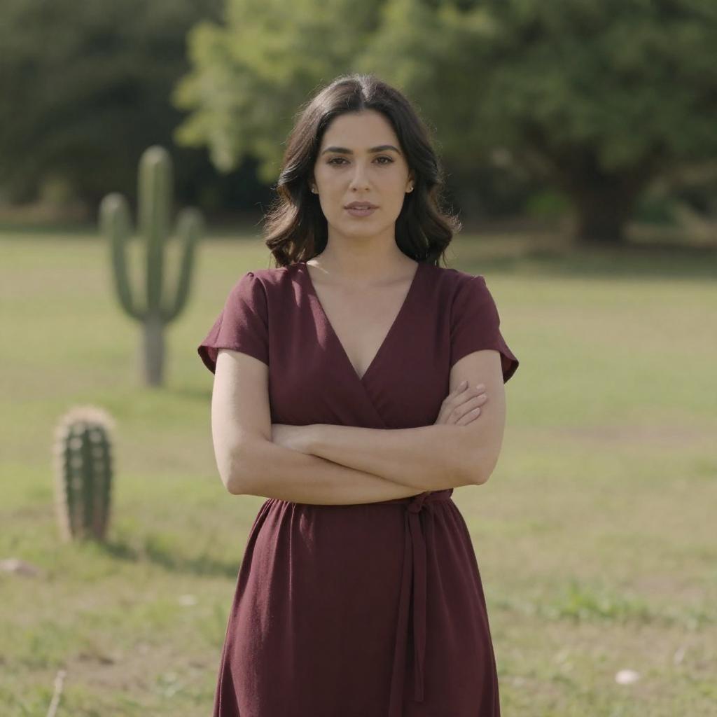 Photograph of a woman with fair skin and dark hair in a maroon dress with a V-neck, standing with arms crossed in a sunlit, grassy field with scattered cacti and a dense green tree line in the background.