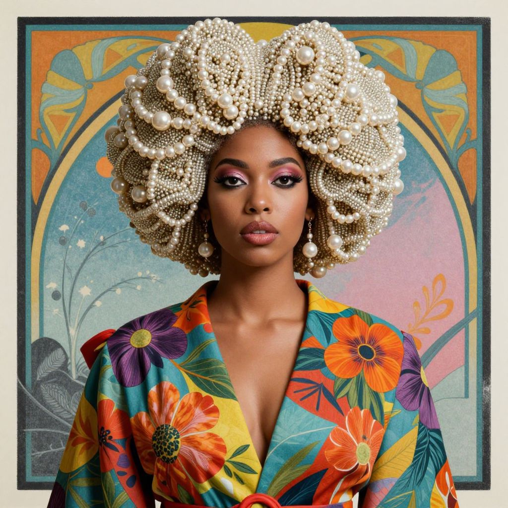 A vibrant, Afrofuturistic portrait featuring a woman with a large, intricate wig made of pearls, wearing a colorful, floral outfit with a geometric background, blending elements of Art Nouveau, Hypermodernism, and Xerography Screenprint Etching.