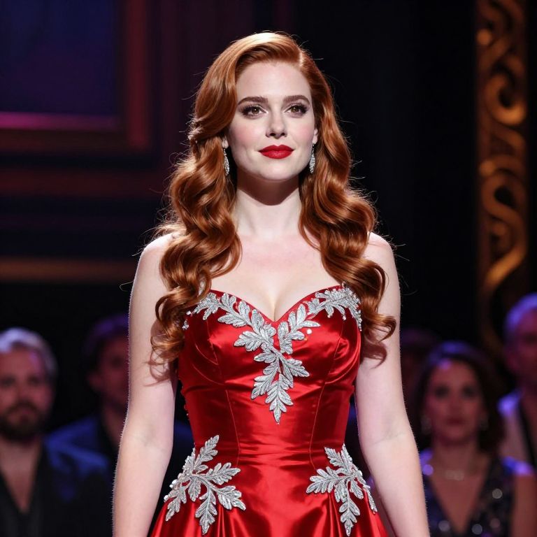 A stunning female actress in her early 30s with warm brown eyes, a defined cheekbone structure, and long wavy auburn hair, dressed in exquisite Broadway attire featuring a bold red satin gown with intricate silver embroidery, standing in the spotlight of a dimly lit Broadway stage during a musical performance, with soft stage lights reflecting off the gown and the audience in the background.