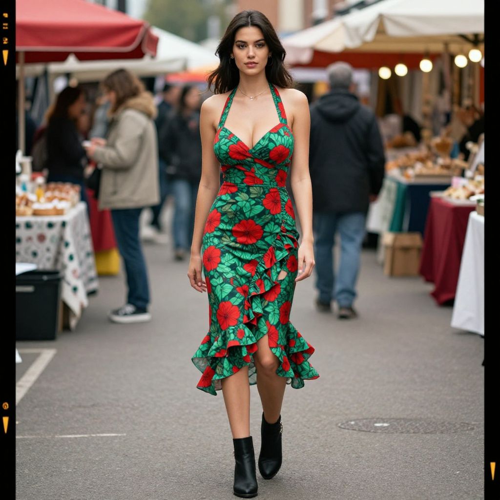 A Slim woman, in a modern romantic ruffled midi dress with a floral print in red and green, halter neck, sleeveless, and calf-length, paired with black ankle boots, captured in the vibrant atmosphere of a street market, styled with Eastman LLP film stock. Sexy. Pretty face and beаutiful eyes. Big breasts