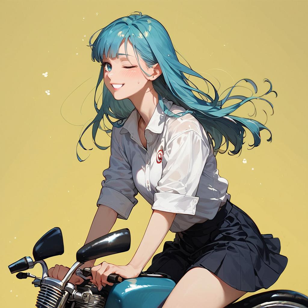 Score_9, score_8_up, score_7_up, score_6_up, score_5_up, score_4_up, source_anime, rating_safe, dollp, plastic skin, detailed hair, smooth hair, (Bulma), riding a sci-fi motorcycle, smile, motor vehicle, skirt, riding, yellow background