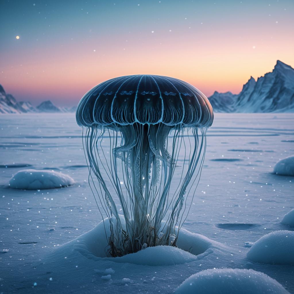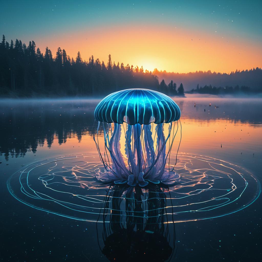 Strange transparent iridescent alien jellyfish emerging from the surface of a glowing bioluminescent lake at sunset, ultra high definition, ultra detailed, symmetrical, foggy, matte painting by Ross Tran, WLOP, Greg Rutkowski
