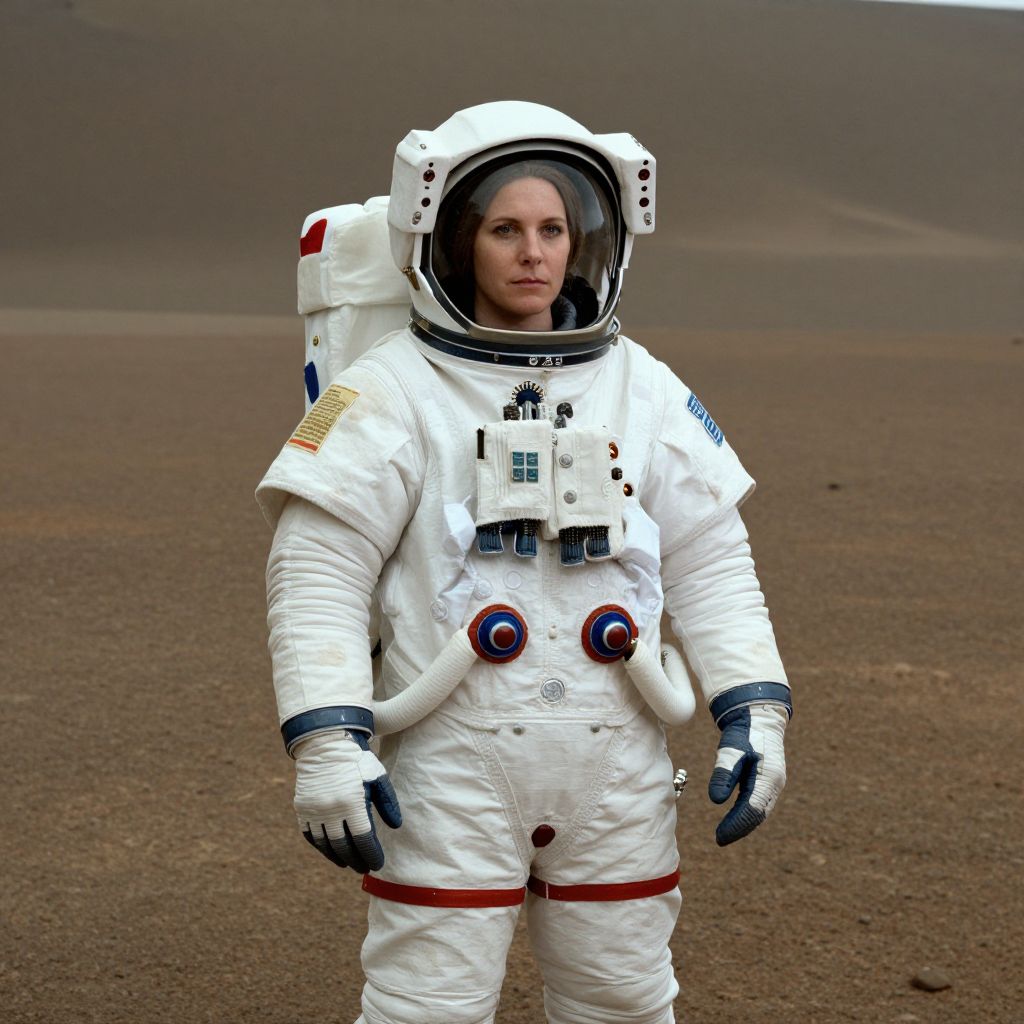 A woman in a space suit and helmet, likely an astronaut, stands on a Martian landscape.