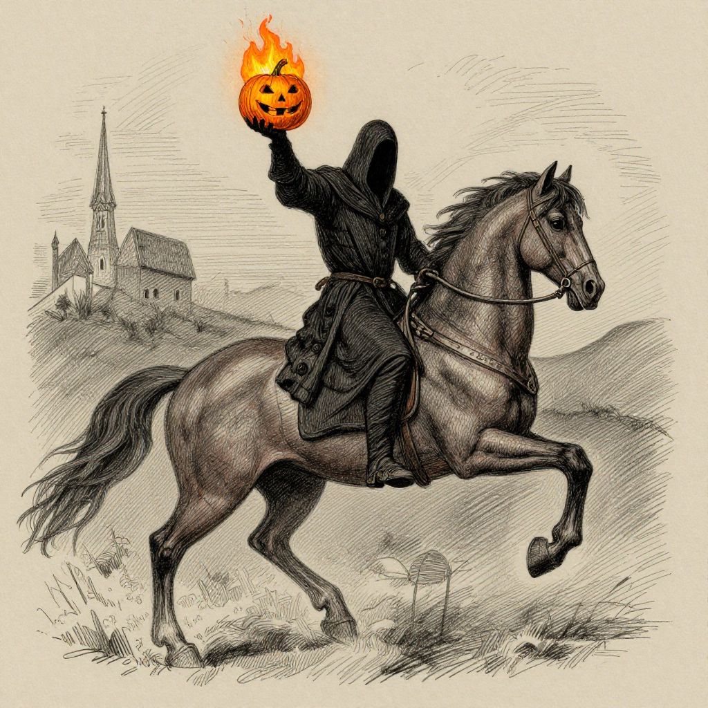 Headless horseman sketch, medieval style, shadowy figure holding a flaming pumpkin head, muscular horse rearing, rough pencil lines with shading, mysterious nocturnal background, classic gothic horror illustration.