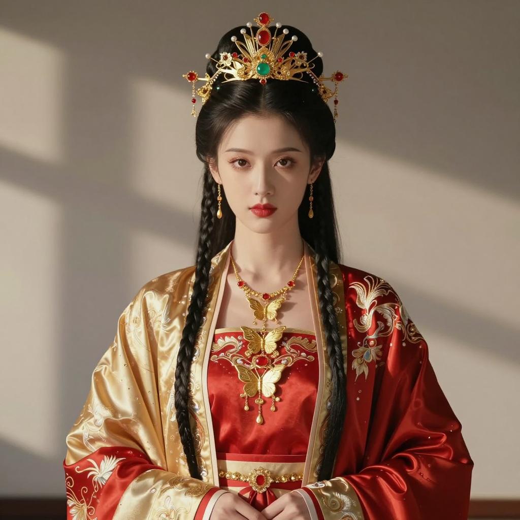 Chun cheongsam, photo-realistic digital art, Asian woman, traditional Chinese qipao dress, floral pattern, red and pink flowers, black background, detailed lanterns, red and gold, traditional Chinese room, wood furniture, vase with flowers, soft light, elegant, serious expression, braided hairstyle, realistic ures, high detail, traditional Chinese setting, realistic lighting