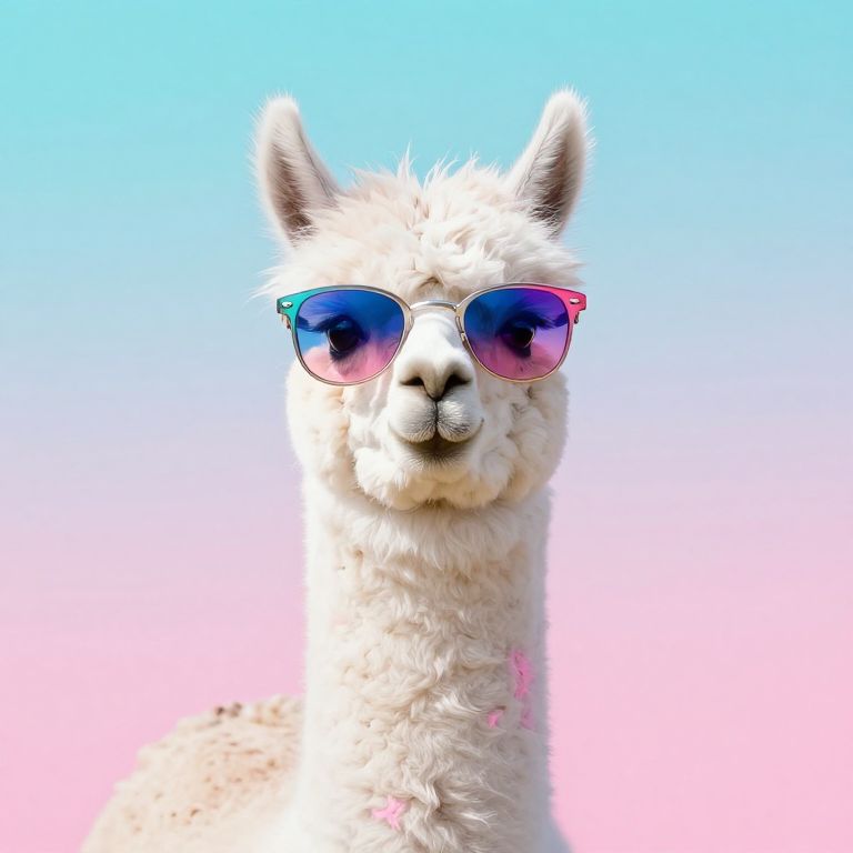 The image features a llama wearing stylish, oversized sunglasses with a vibrant, gradient lens that transitions from blue to pink. The llama's fur is a soft, fluffy white with a hint of pink on its neck, adding a touch of whimsy to its appearance. The background is a gradient of pastel colors, transitioning from a bright turquoise at the top to a soft pink at the bottom, creating a harmonious and visually appealing backdrop. The llama is positioned in a middle shot portrait, with its head slightly tilted, giving it a playful and engaging expression. The overall composition is balanced, with the llama centrally placed and the gradient background providing a smooth, seamless transition that enhances the subject's prominence. The image exudes a sense of fun and creativity, with the combination of the llama's stylish sunglasses and the vibrant, pastel background creating a visually striking and memorable scene.
