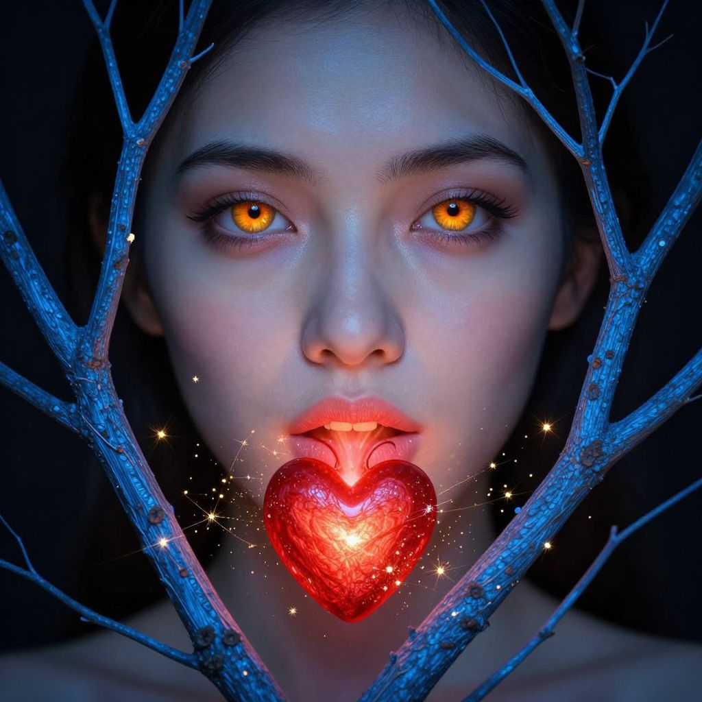 Ethereal portrait of a woman with piercing amber eyes, her face framed by intricate blue branches, featuring a radiant red heart glowing beneath her lips, surrounded by golden sparks and twigs against a dark background.
