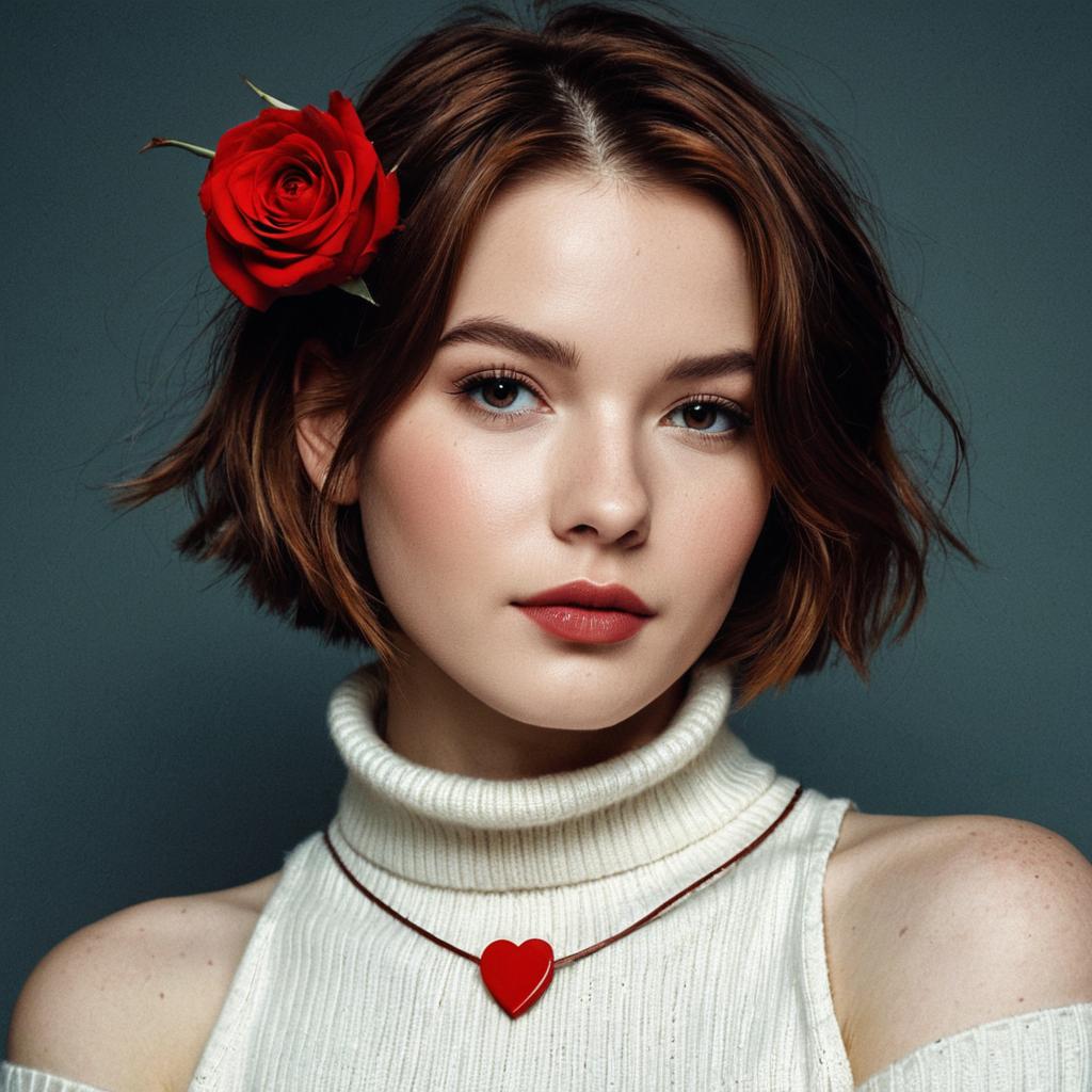 (score_9, score_8_up:1.1), score_7_up, 1girl, solo, expressive, hearts, dynamic, brown hair, short hair, brown eyes, pale skin girl, pale skin, freckles, turtleneck, bare shoulders, blush, red rose in hair, looking_longingly, seductive, sexy_woman