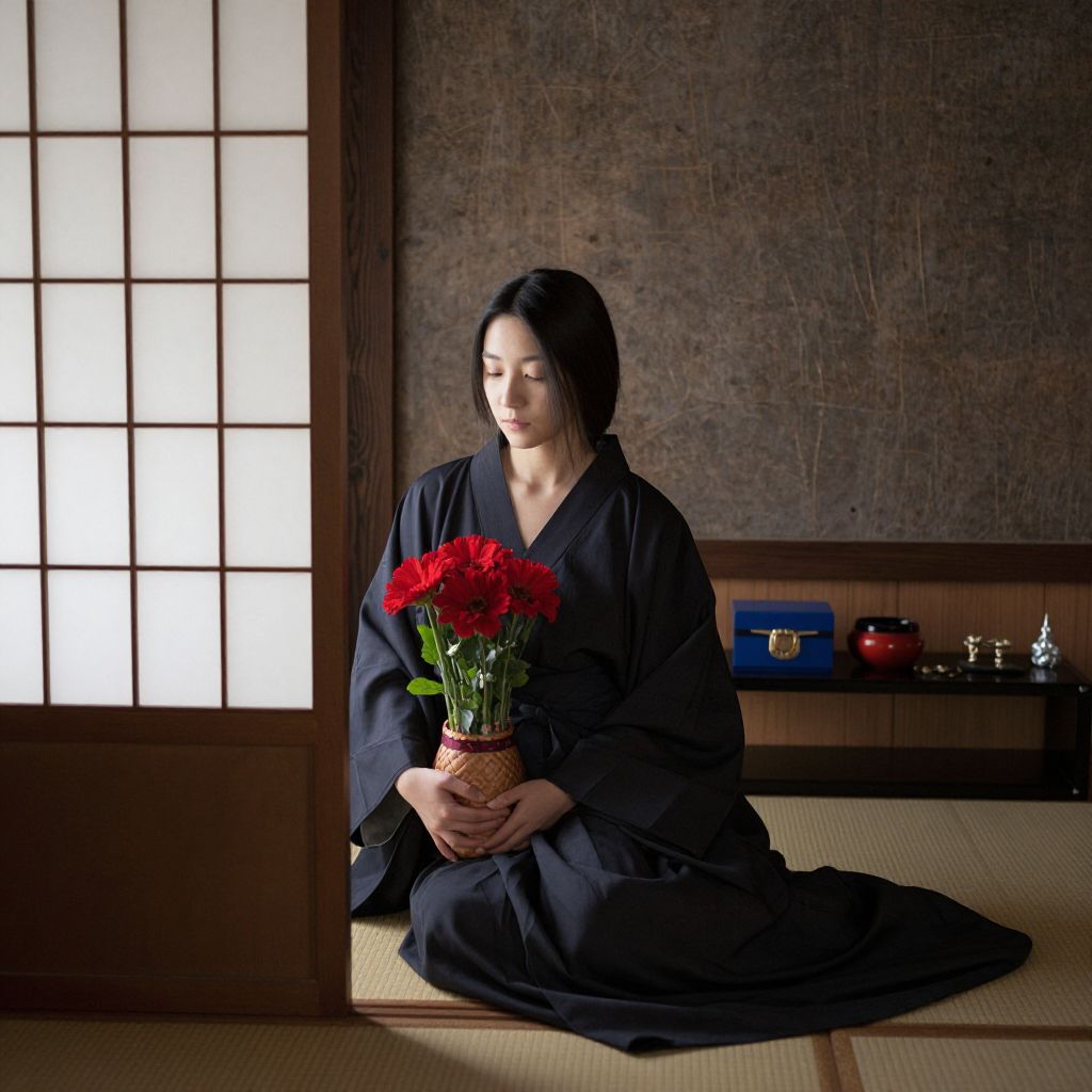 The image depicts a serene scene of a woman sitting on the floor, dressed in a dark, flowing robe, holding a basket of red flowers. She is positioned in front of a traditional Japanese sliding door, which is adorned with a grid pattern. To her right, a shelf holds various objects, including a blue box, a red container, and a small, intricate object that appears to be a piece of jewelry or a tool. The background features a wooden wall with a textured surface, adding depth to the scene. The overall composition is balanced, with the woman and the basket of flowers being the central focus, while the shelf and the sliding door provide context and a sense of place. The colors are muted, with the red flowers standing out against the dark robe and the neutral tones of the surroundings. The interplay of textures, from the smooth surface of the robe to the rough texture of the wooden wall, adds to the visual richness of the image.