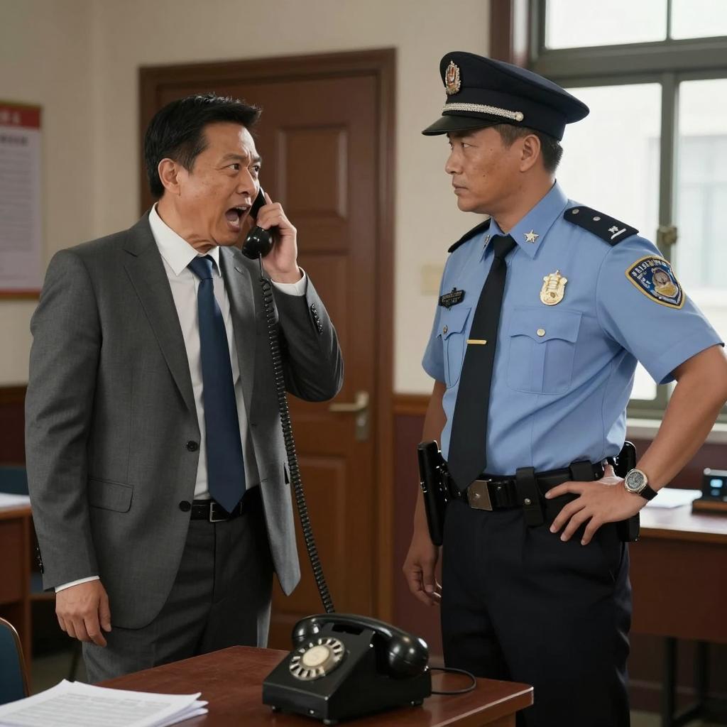 Man with short black hair, open mouth, green plaid shirt, sweat on face, wearing a digital monitor "306" on chest. Two men, one with gray hair, black shirt, holding monitor, other in gray sweater, standing close. Police officer in background. Office setting with fluorescent lights. Background blurred.