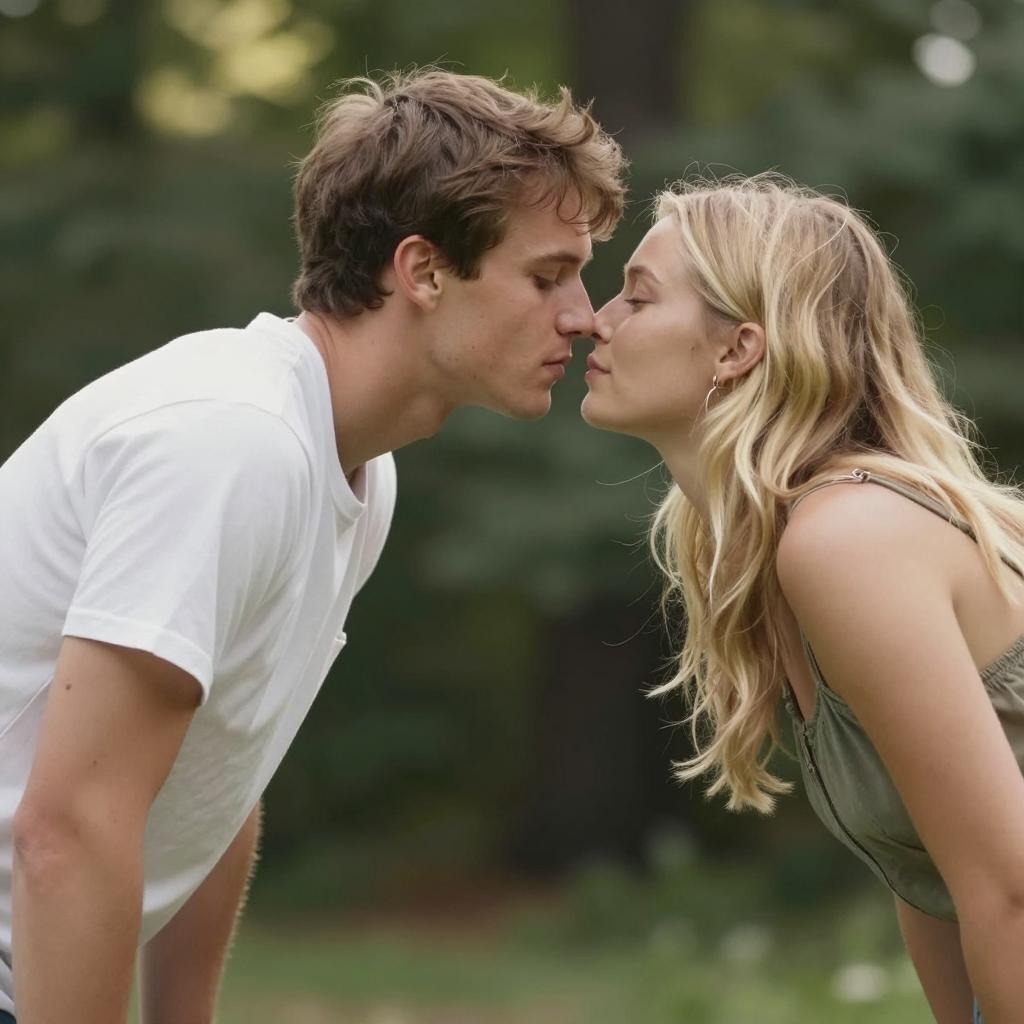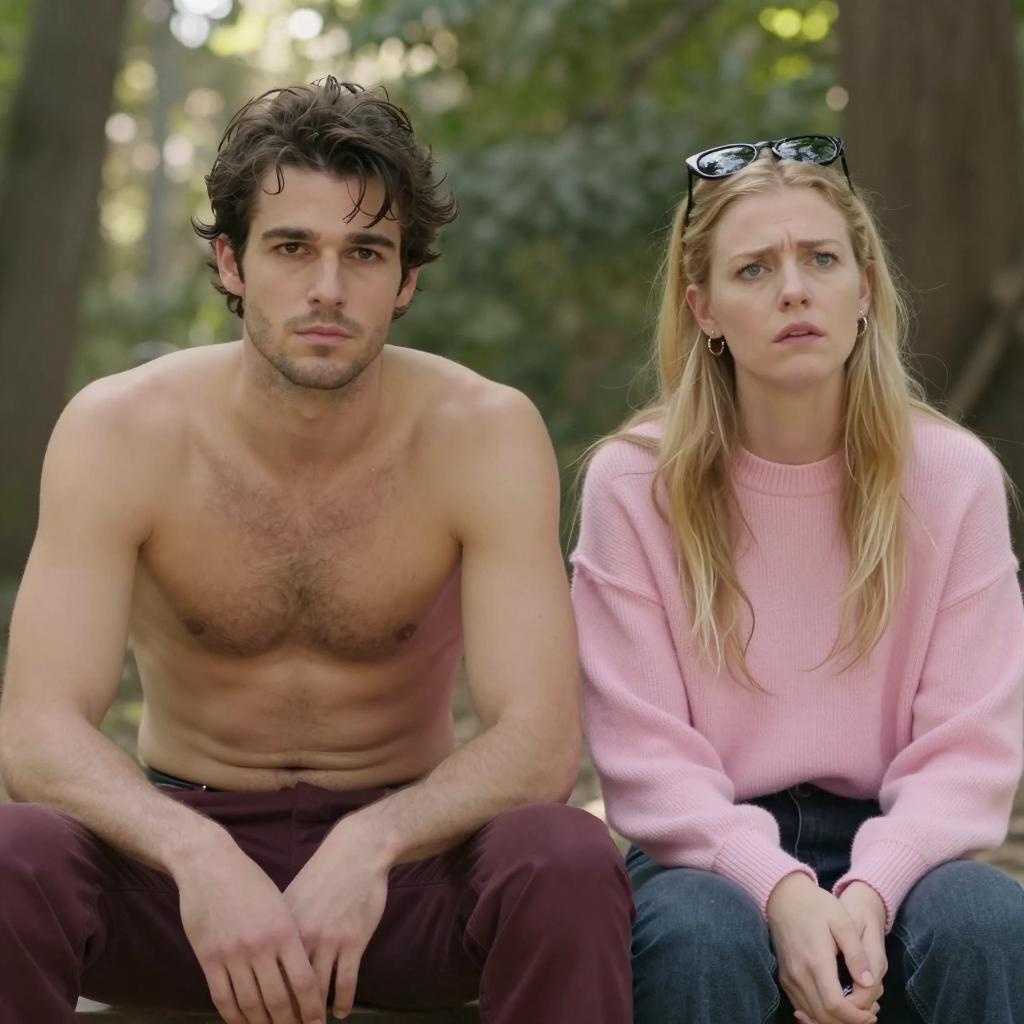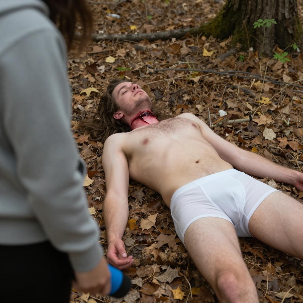 Photograph of a forest path. A woman with shoulder-length brown hair, wearing a gray jacket and blue skirt, stands over a shirtless, muscular man with light skin, white underwear, and white socks, lying on the ground. His head is turned away. Her right hand holds a small object. Red and white shoes are on the ground near the man. Dense green foliage and a rock are in the background. The man is on his side, with his legs bent.