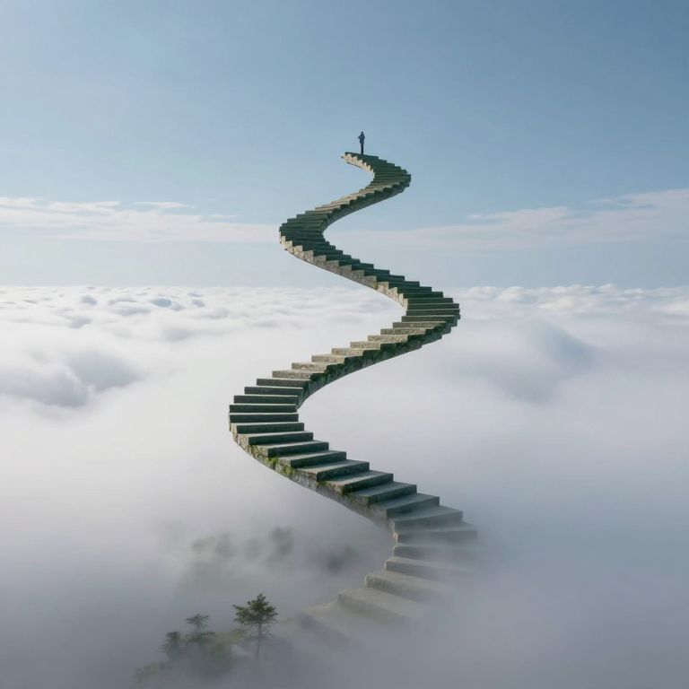 Suspended between earth and sky, a serpentine staircase of stone and green whispers of transcendence, inviting solitary travelers to ascend through the ethereal embrace of clouds, where the weight of gravity dissolves into the boundless promise of freedom and the quiet mystery of the unknown.