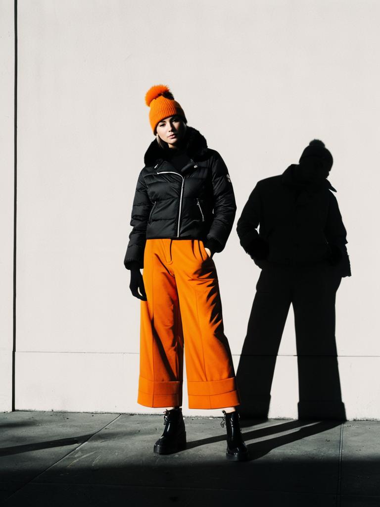 Woman, winter chic, pastel pink puffer jacket with high wrap-around collar, diamond stitching, cropped length, faux fur cuffs, matching pink slim-fit trousers, ribbed knit beanie, photo studio background --sref 1441