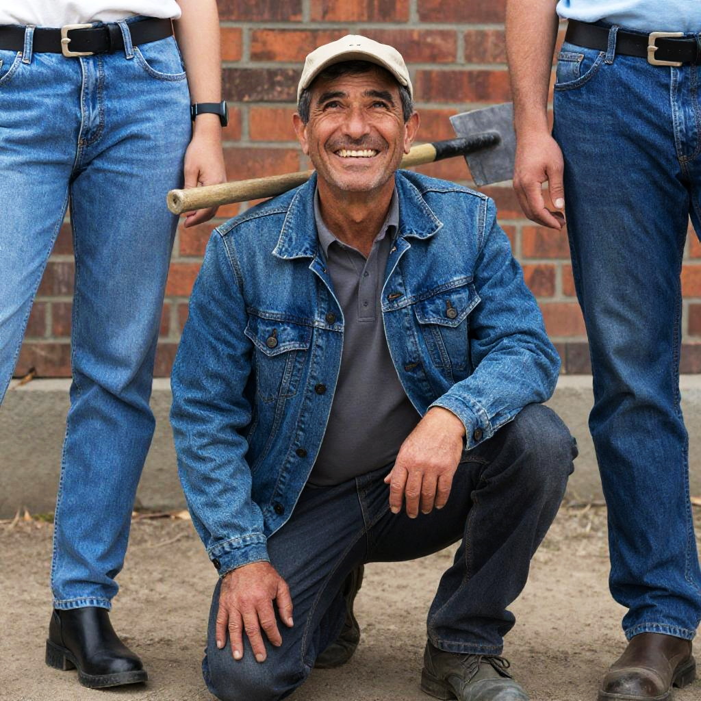Photograph of a middle-aged man with a wide, toothy grin, wearing a blue denim jacket, gray shirt, and beige cap. He kneels in dirt with two people's blue jeans and black belts on either side. Brick wall in background. Man's eyes look upwards. Shovel rests on his right shoulder.