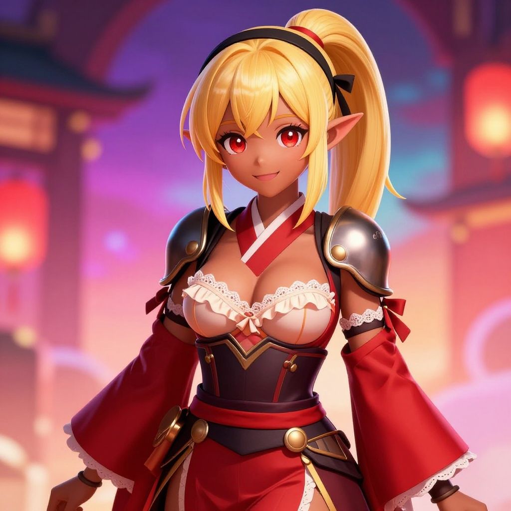 Chloe, 1girl, ponytail, red eyes, 'Clothed Female', kimono, blonde hair, bra, covered body, small breasts, Ponytail, Pants, Suit, Bodysuit, hairband, Japanese Attire, sash, 'Small Breasts', fully clothed, clothed, happy smile, brown skin, dark skin, pointy ears, lace-trimmed dress, coat dress, frilled bra, elf ears, ribbon, bangs, bodysuit, pauldrons, armor, covering breasts, (masterpiece:1.1)intricate eyes, beautiful detailed eyes, symmetrical eyes, (dark-skinned female:1.2), (glowing eyes:1) cute, adorable, happy, (centered, scale to fit dimensions, Rule of thirds), (ultra detailed, extremely detailed), (photorealistic artwork:1.37), (extremely detailed CG unity 8k wallpaper), (((vibrant colors, vibrant theme))), (intricate), (masterpiece), (best quality), vanilla