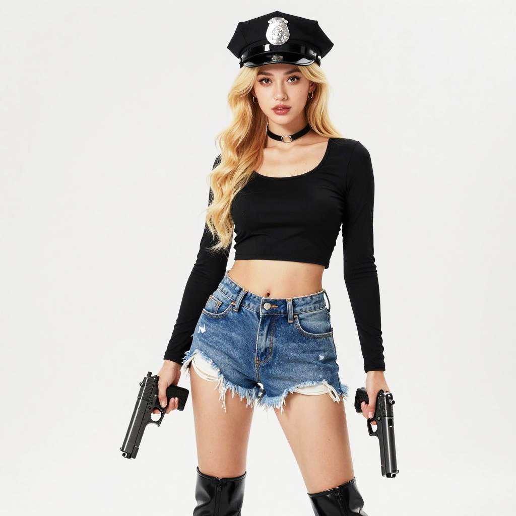 Photograph of a blonde woman with long, wavy hair, wearing a black police cap with a silver badge, a black long-sleeve crop top that reveals her midriff, and frayed denim shorts. She holds a black handgun in each hand and wears black knee-high boots. Her top has an American flag patch on the right sleeve. She has a tanned complexion and a confident expression. The background is plain white, making her the focal point. The image has a high-contrast, vibrant color style, emphasizing her attire and accessories.