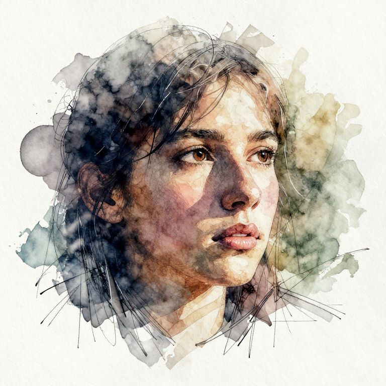 This is a digital watercolor portrait of a young woman with light brown skin and dark brown hair. Her hair is slightly messy, with strands falling around her face. She has large, expressive brown eyes that look to the right, a small nose, and full lips with a slight pink hue. The watercolor technique uses loose, fluid brushstrokes with splashes of color, blending shades of brown, black, and white. The background is a mix of muted greens, blues, and yellows, creating a soft, abstract backdrop. The portrait is detailed yet abstract, with a focus on the subject's face and eyes.