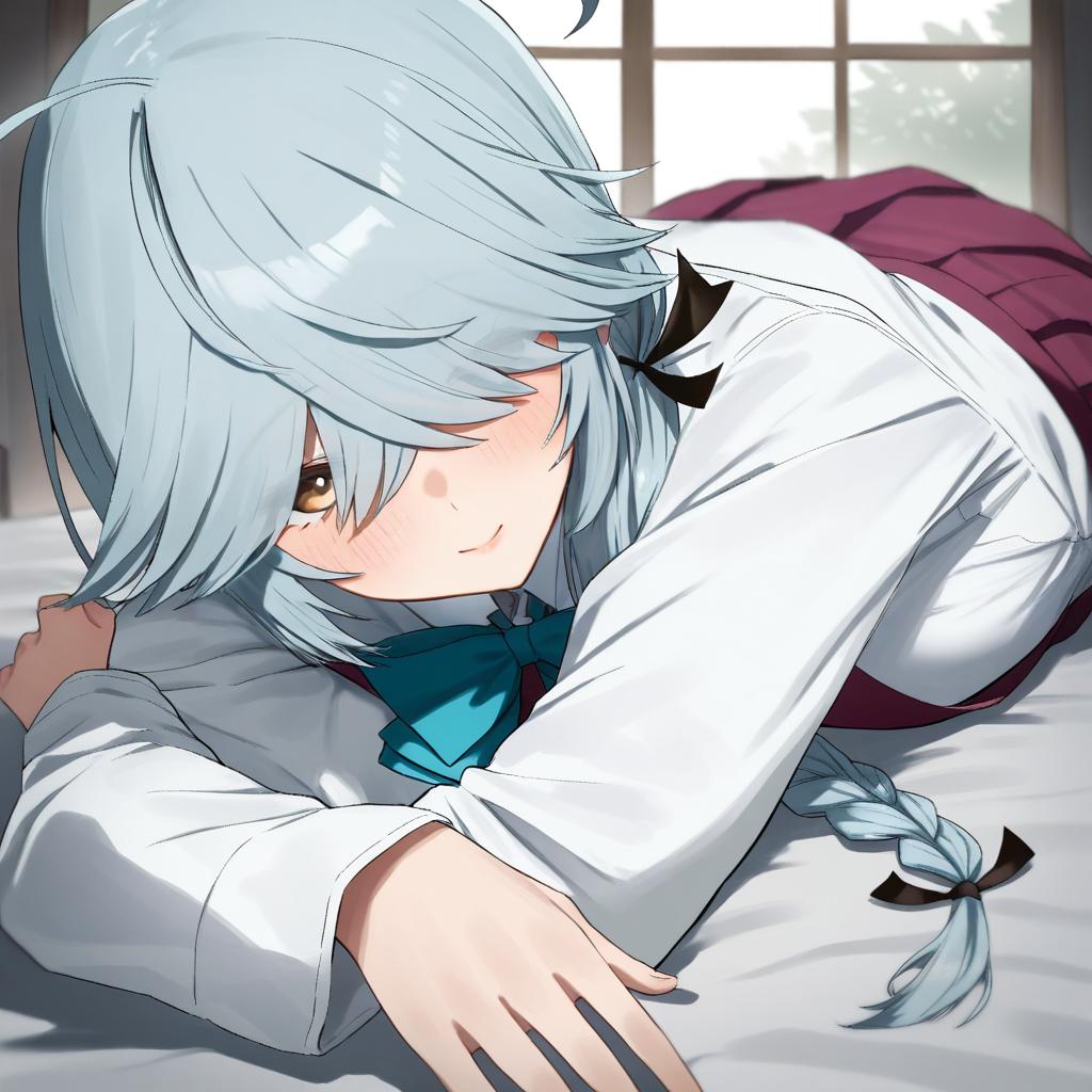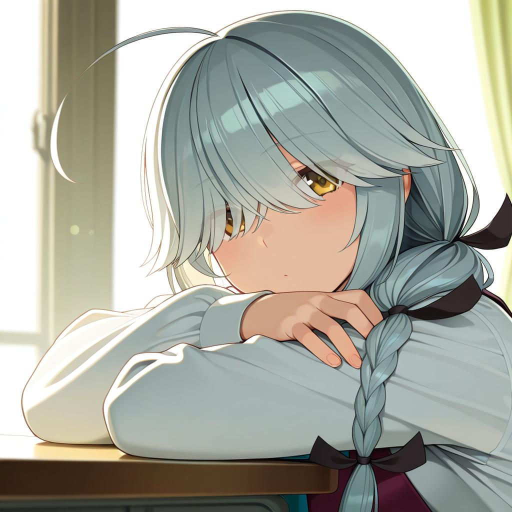 Hamanami (kancolle), kantai collection, 1girl, hair over eyes, brown eyes, hair over one eye, long hair, grey hair, single braid, ahoge, hair ribbon, school uniform, white shirt, school uniform, long sleeves, black ribbon, by artist mac star, illustrious