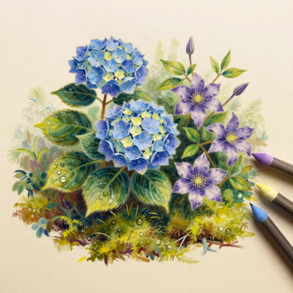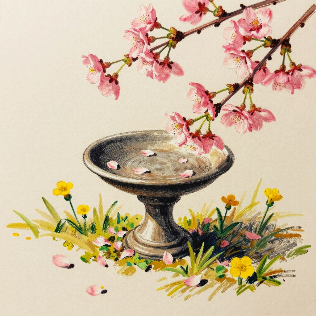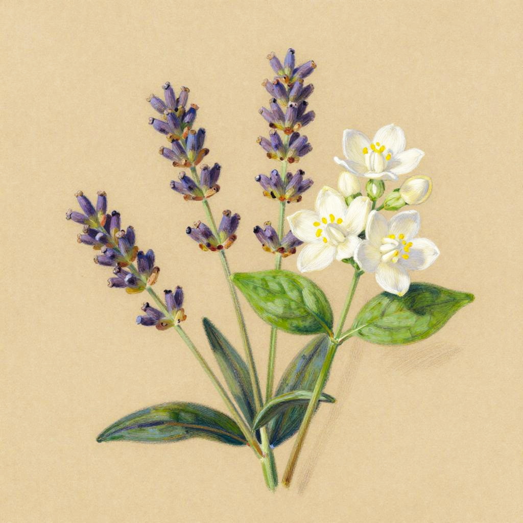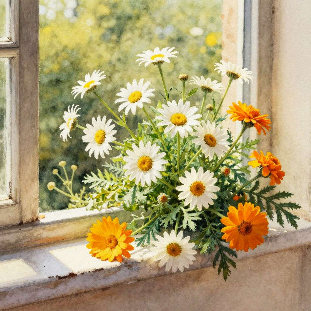 No humans, traditional media, painting (medium), silverpoint and watercolor, window ledge cluttered with herbs, botanical focus on white daisies and orange marigolds, nature, green leaf details, warm yellow accents, soft natural light, textured paper surface, balanced composition, painterly brushwork, serene mood, gentle shadows, high detail petals and leaves, subtle background, cohesive color harmony