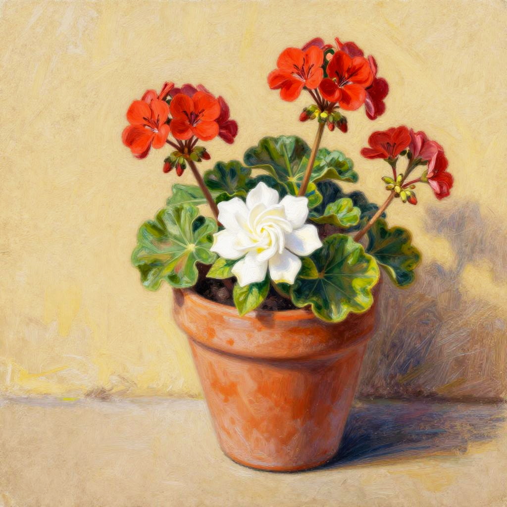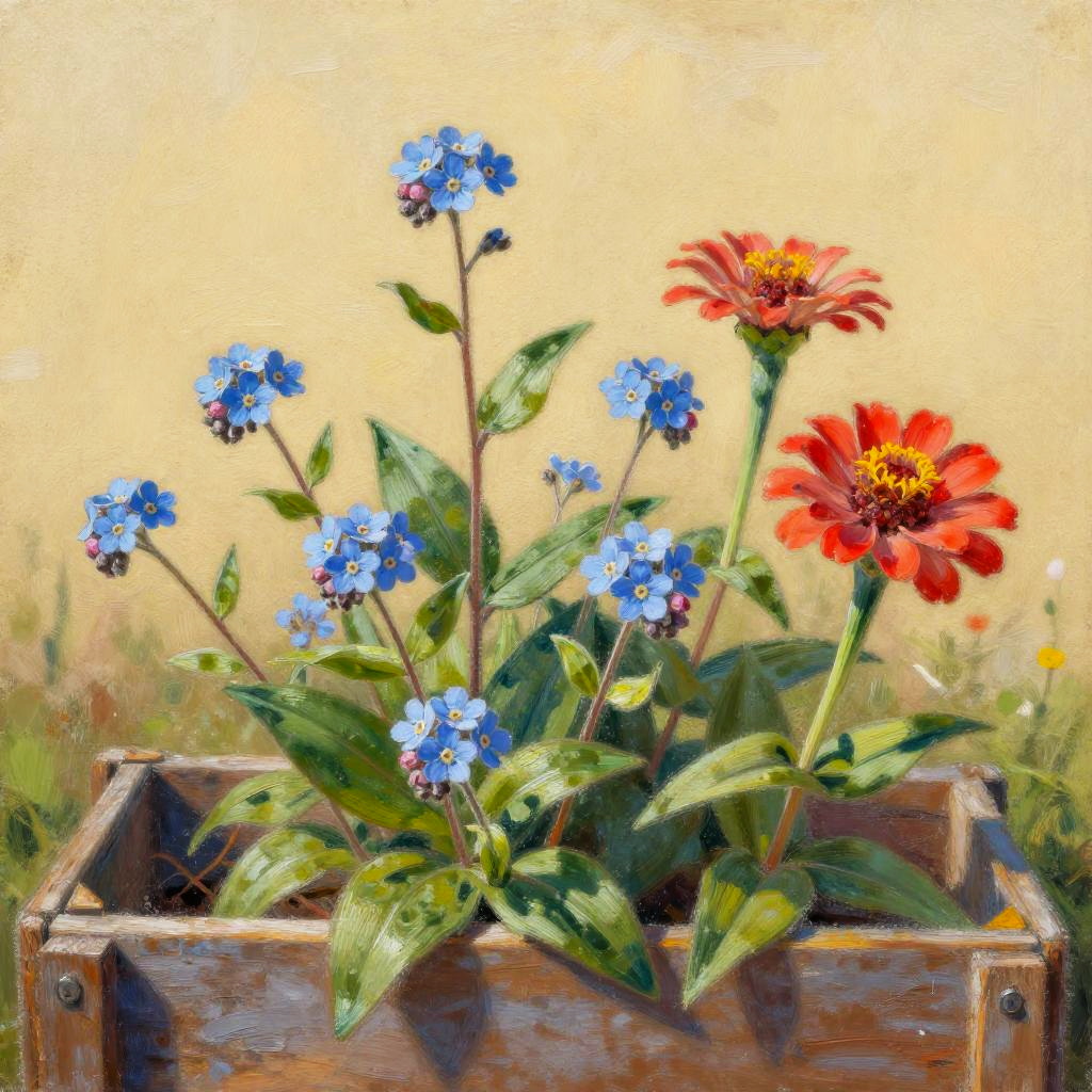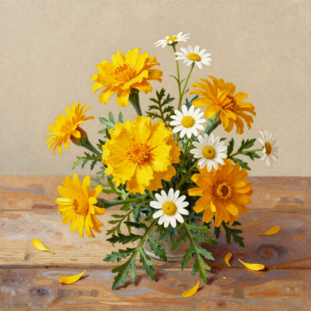 Botanical Painting with Daisies and Marigolds on Window Ledge