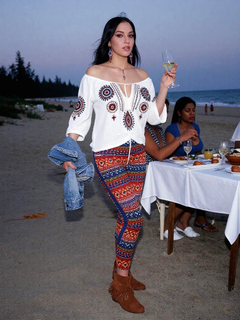 A bohemian athletic woman in a white off-shoulder blouse with tribal embroidery, carrying a denim jacket, and wearing multicolored patterned leggings in red and blue, along with brown suede fringed ankle boots, captured in the visual style of kodachrome analog film, enjoying a Dusk Beach Dinner on a Sandy Shore. Sexy. Pretty face and beаutiful eyes. Big breasts