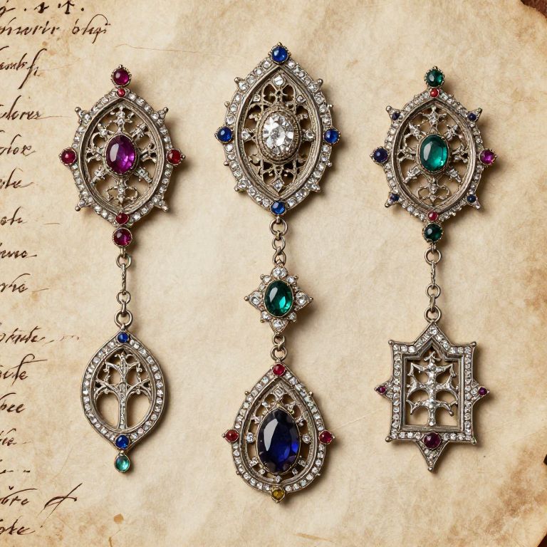15th century jewelry consisting of elaborate brooches and pendants with gothic designs, embedded with diamonds and colored stones, placed on aged parchment with calligraphy