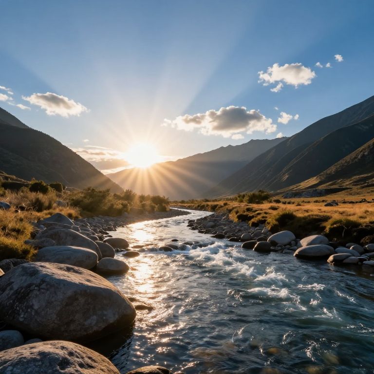 Photograph of a serene mountain landscape at sunset. The sun, low in the sky, casts golden rays through scattered clouds, illuminating a rocky stream in the foreground. Smooth, round stones are scattered along the stream's edge, which reflects sunlight. The background features dark, silhouetted mountains with patches of golden grass. The sky is a vibrant blue with white clouds. The overall scene is calm and picturesque, with the sun's rays creating a radiant effect on the water and rocks.