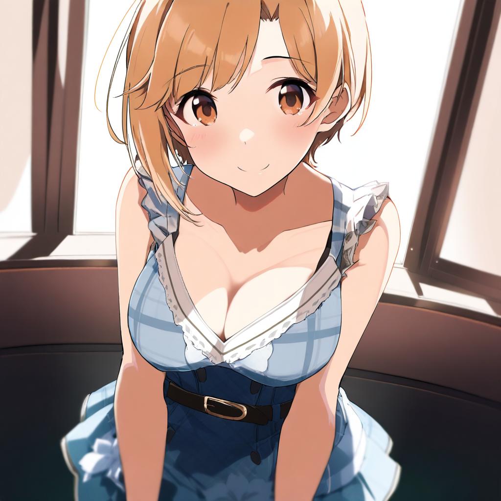 Aiba yumi, idolmaster, 1girl, brown eyes, short hair, blonde hair, brown hair, medium breasts, cleavage, collarbone, by artist komb, animagine