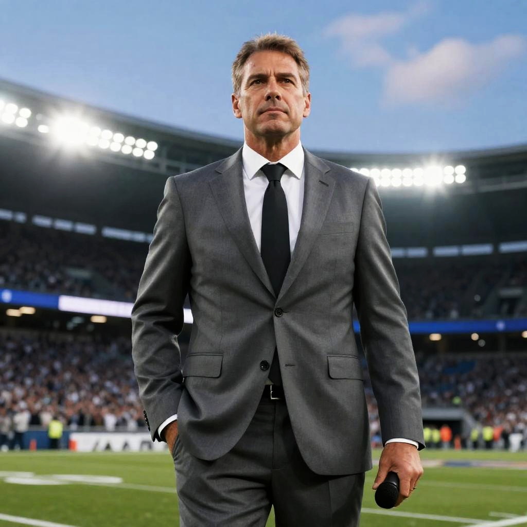 Photograph of a white man with light brown hair in a black suit and white shirt standing behind a wooden podium. NFL and "DRAFT" in the background. He looks to the right with a neutral expression. Bright blue background with white and white . NFL shield above "DRAFT" .